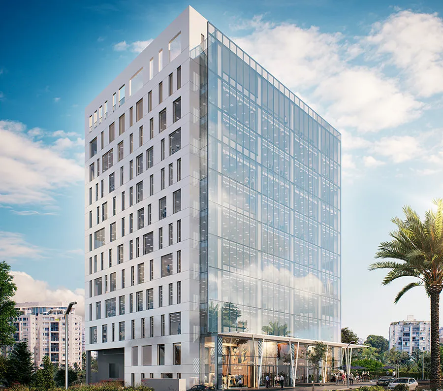 מבנה משרדים בעיצוב אדריכלי ייחודי ומודרני, המכיל 12 קומות של שטחי משרדים וקומת מסחר